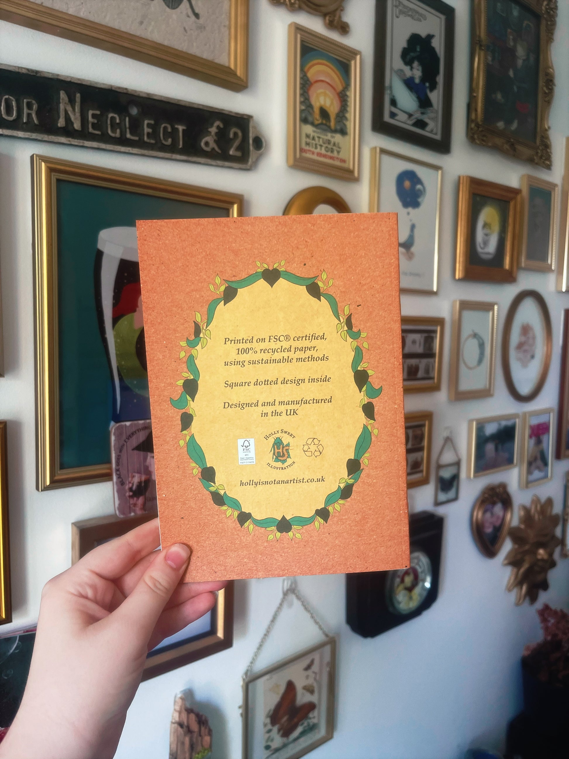 This notebook features a hand-illustrated front, back, and inner page design, printed on 250gsm recycled paper. Once you’ve used up the notebook, it is 100% recyclable!